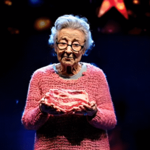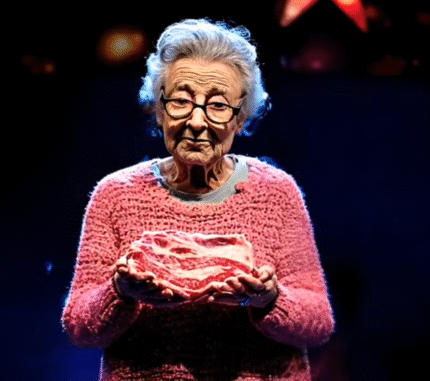 She stepped onto the stage in a pink knitted sweater, holding something unexpected — a raw piece of meat. The audience tilted their heads, unsure what they were seeing. And yet, she stood there with calm purpose, holding it like it was a sacred object.