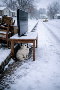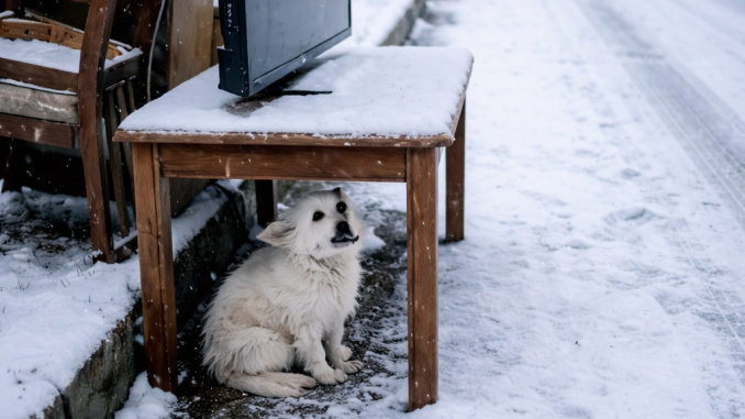 On the side of the road, beneath an old wooden table placed out with discarded furniture, a small white dog sat alone. Snow gathered on its fur. The cold pavement beneath it offered no comfort. The world around it felt abandoned — silent, indifferent.