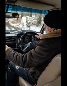 Trusting his instincts, the man slowly stepped out of the vehicle. The tiger didn’t move closer. Instead, he turned and walked a few steps away, stopping to look back—waiting.