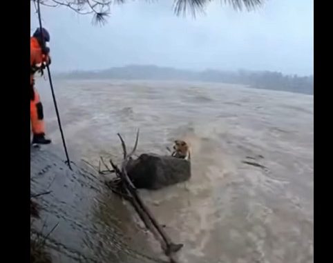A rescue team reached a frightened dog stranded on a concrete block, surrounded by fast-moving floodwaters during severe flooding. The strong current and dangerous conditions made the operation extremely challenging, leaving little room for error.