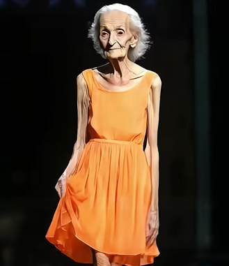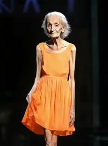 Each step she took was deliberate, gentle, powerful. The orange dress danced around her legs with every movement, glowing against the backdrop of an industry that often worships youth.