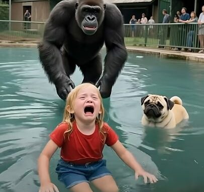 It was one of those sun-washed zoo afternoons when strollers roll in slow lines, laughter skips between exhibits, and every turn promises a new wonder. A small girl with bright, honey-colored hair wandered to the edge of the gorilla habitat, a tiny pug tucked in her arms like a plush toy. She leaned in—just a little—and the world tilted. In an instant, she slipped over the stone barrier and tumbled down into the shallow moat below.