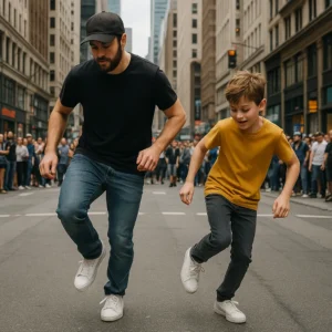 Then it happened. With a loud click, the speaker came to life, and a thumping bass rolled out into the air. The first notes of a fast-paced shuffle track cracked the city’s monotony like lightning through a clear sky. People nearby paused. Some looked over, puzzled. Others slowed their walk, intrigued. The man nodded once to the boy, who grinned wide, and the two began moving.At first, it was smooth and simple—synchronized steps, coordinated footwork, casual arm swings. But within seconds, the complexity increased.