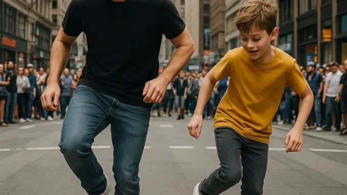Kids mimicked the dance right there on the pavement, laughing, trying to copy the magic they’d just witnessed.The man smiled but said nothing. The boy looked around, flushed with pride and joy. They nodded at each other, bumped fists, and then casually walked away—leaving behind a crowd that stayed standing, clapping, and buzzing with disbelief.
