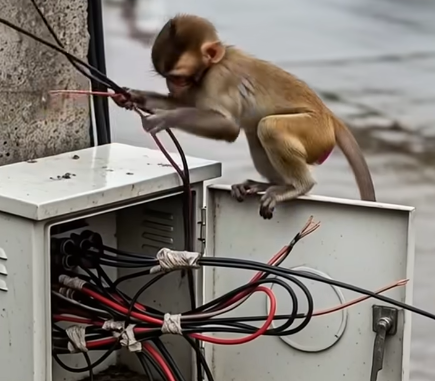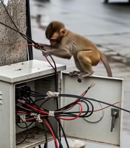 A baby monkey, no more than a few months old, had climbed onto a tangle of electrical wires protruding from an open utility box. He was curious—curious in the way only the young and innocent are. His tiny fingers tugged at loops of rubber and copper. His tail balanced lightly on the rusted metal lid. He didn’t know what danger looked like. He didn’t know the difference between curiosity and catastrophe.
