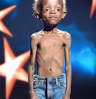 The auditorium lights dimmed, and the judges leaned forward, expecting another act filled with energy, costumes, or music. But instead, what stepped onto the stage was a small boy — frail, thin, wearing oversized, torn jeans that slipped down his narrow frame. His bare chest revealed ribs that seemed to press against his skin, and his large, wide eyes scanned the room with a mixture of fear and determination.