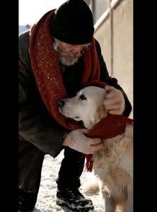 On a freezing winter street, a homeless old man notices a stray Golden Retriever shivering alone in the cold.