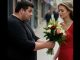 From the ground, the dog presents a diamond ring to his friend.