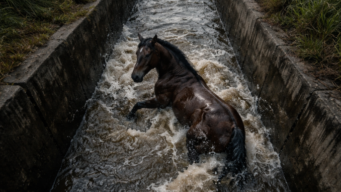 The concrete sides were too steep. The water, though not deep, was forceful enough to make standing nearly impossible. Every attempt to rise ended in another violent splash. The animal’s breathing grew heavier. Panic set in. There was no way out.