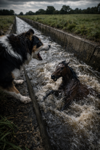 A farm dog reached the canal’s edge and froze. Below, the horse struggled desperately. The dog barked — not casually, not playfully — but urgently. It paced back and forth, ears pinned, body tense. It understood something was very wrong.