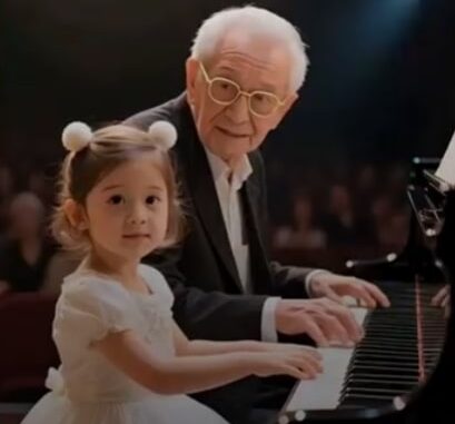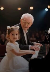 The theater was quiet that evening, with only the sound of whispers and shuffling feet before the lights dimmed. On stage sat an elderly man with white hair, his back slightly bent but his spirit unbroken. Beside him, a little girl in a flowing white dress swung her legs nervously, her small hands resting on the piano keys.