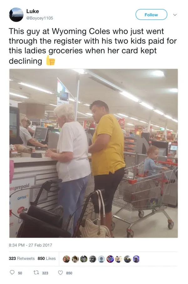 A father was in a supermarket with his two children. While waiting in line, he noticed that the elderly woman in front of him was going through something awful. He gave her something, and he became a star right away.