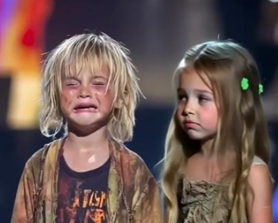 On a brightly lit stage, where dreams are usually born, two fragile figures emerged from the shadows — a little boy and girl, their tiny hands holding onto worn-out bags that seemed heavier than their hearts. Their clothes, torn and weathered, whispered silent tales of hunger, cold nights, and endless wandering. The boy’s face was streaked with tears, his blonde hair tangled, as though each strand carried a story the world had long forgotten. Beside him stood the girl, quiet and composed, her small green hairpin holding back locks that framed eyes too deep for her tender age.