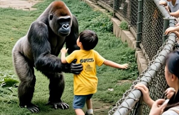 What happened next defied every expectation. Instead of aggression, the gorilla’s movements were slow, deliberate, and astonishingly gentle. His deep, observant eyes studied the boy, and with one enormous arm, he reached out. But it wasn’t an act of violence — it was protection.