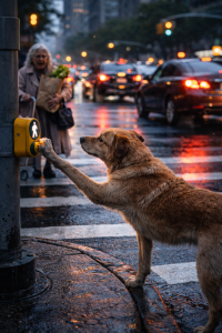 Without hesitation, he stepped toward the crosswalk pole. Carefully, he raised his paw and pressed the pedestrian button. Moments later, the traffic lights changed. Cars slowed and finally stopped. The woman looked surprised. Slowly, she began crossing the street.