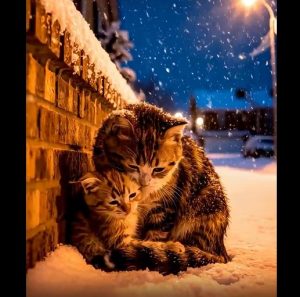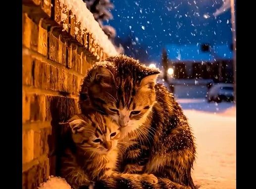 In the middle of a freezing winter night, a mother cat was seen carrying her tiny newborn kitten through the snow. Weak, cold, and desperate, she approached the door of a stranger’s home — a last attempt to save her baby from the deadly cold.