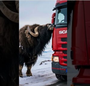 As night fell, the temperature plummeted. The driver shivered inside his car, desperate for warmth. Miraculously, the musk ox pressed itself close to the vehicle, blocking the icy wind. Its heavy body acted like a living shield, keeping the worst of the cold at bay. The animal stayed near all night, almost as if it understood that its presence was saving a life.