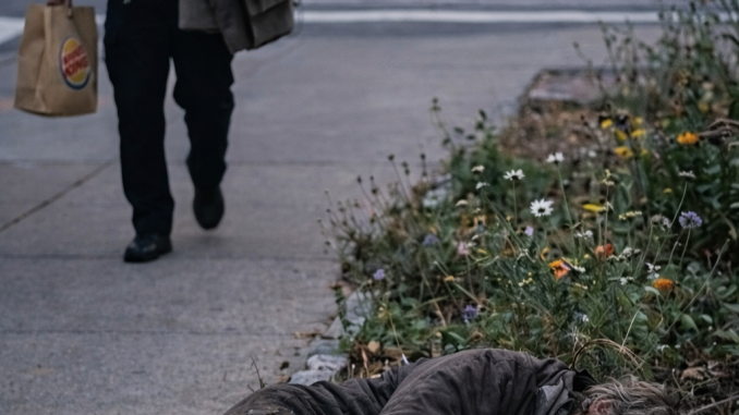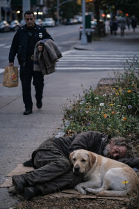 On a quiet city sidewalk one evening, a homeless man slept on a piece of cardboard near a small patch of wildflowers. Beside him, his loyal Labrador remained alert, watching the world pass by.