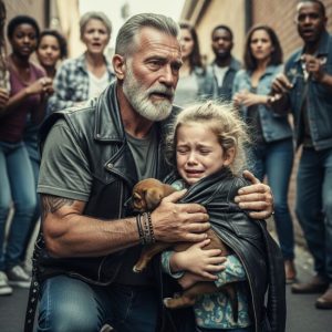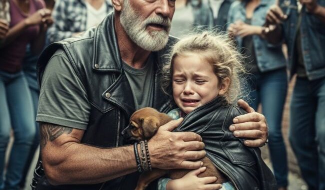 An old biker kneels to shield a lost little girl and her shaking dog in a crowded alley, triggering a chain of events that seem simple on the surface but hide a truth painful enough to silence an entire street.