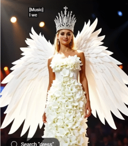 To the audience’s astonishment, a woman emerges wearing a breathtaking dress made entirely of those same white flowers.