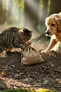 Time passed, and the old man, the cat, and the golden retriever became inseparable. One day, while collecting wood together, the cat suddenly darted off into the distance. Alarmed, the old man followed closely. He soon found both the cat and the dog digging frantically at a mound of soil.