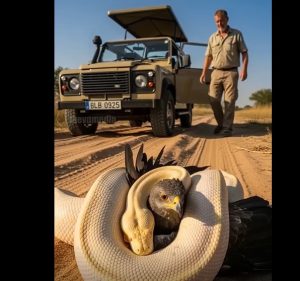 The ranger grips the snake’s body, twisting with quick, practiced motions to loosen its hold without breaking the eagle’s wings. The snake fights back, striking the air around him, hissing, coiling tighter around the bird’s neck. It’s chaos — a blur of movement, dust, and raw survival instinct.