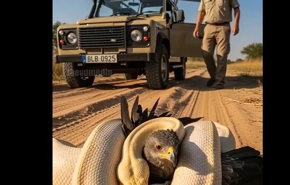 The video captures everything in brutal clarity. The snake tightens, the eagle weakens, and for a moment, it seems too late… until the ranger reaches down and grabs the serpent with both hands.