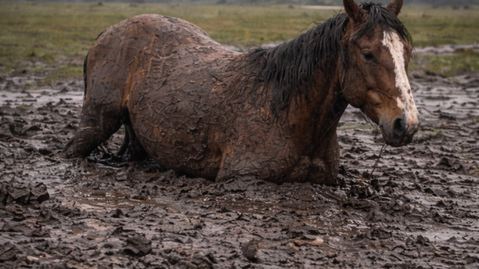 Under a heavy grey sky, a massive horse stood trapped in thick mud. Every attempt to move only pulled him deeper. His powerful legs — usually symbols of strength — were now useless against the weight beneath him.
