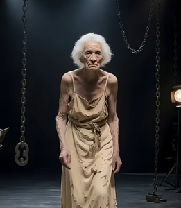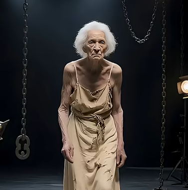 The theater was dimly lit, heavy chains hanging from above, the stage floor glimmering as if fractured glass had captured the reflections of a thousand stars. And then she entered — a woman whose very presence silenced the room. Her frail frame and weathered features spoke of a long life lived, but her eyes carried a spark, a quiet defiance that told the audience they were about to witness something far greater than appearances could ever reveal.
