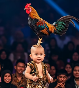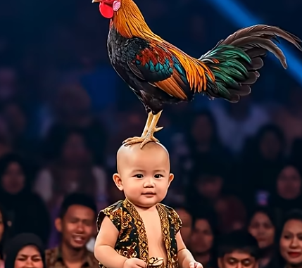 The baby reached up, stretched his arms, and the rooster — with majestic grace — leapt into the air, spreading its wings wide under the spotlights.