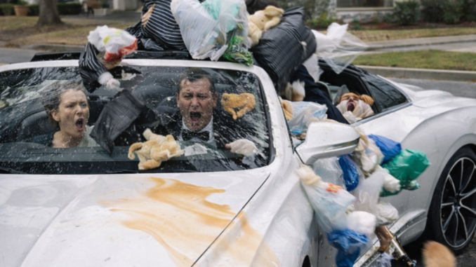 Minutes later, the same luxury car the couple proudly drove became the center of attention. Drinks splashed. Trash bags flew. Garbage covered the seats. Shock replaced their arrogance.