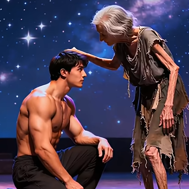 Then, from the opposite side of the stage, a young man appeared. He was strong and graceful, every step measured, his presence commanding. The contrast between them was striking—she, fragile and wrinkled with time; he, powerful and radiant with youth.