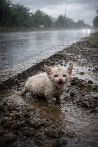 Its fur clung tightly to its fragile body. Each drop of rain felt heavier than the last. It tried to stand tall at first, mouth open in a desperate cry — but the storm didn’t answer.