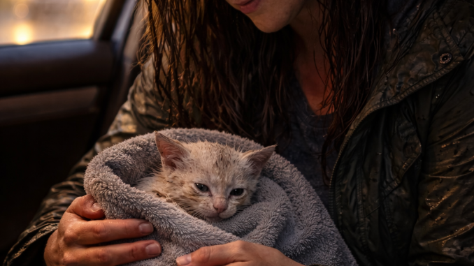 She wrapped the kitten in a dry towel and held it close for a moment before placing it carefully on the passenger seat.