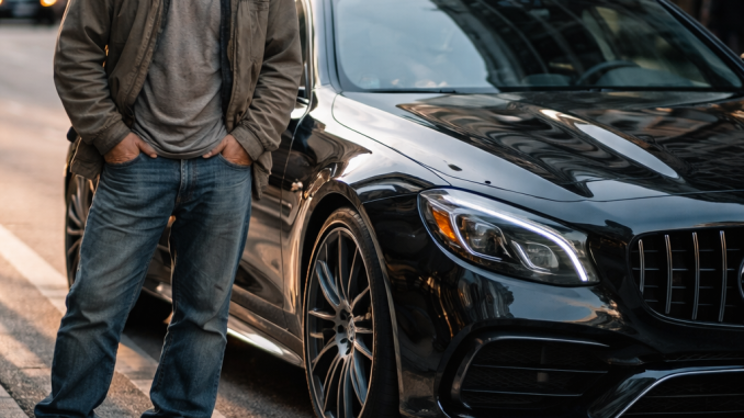On a quiet afternoon in the city, a poorly dressed man stood beside a sleek, imported luxury car. His clothes were worn, his shoes dusty, and his posture relaxed but unnoticed. To most people passing by, he looked like someone who didn’t belong near such an expensive vehicle.