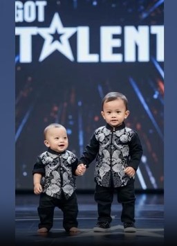 At first, the audience chuckled softly — not out of mockery, but out of pure sweetness. Two tiny boys, barely steady on their feet, toddled onto the huge stage while holding each other’s hands like it was the only thing keeping them from falling. Their matching outfits shimmered under the lights, their bare little feet pattered across the floor, and though they couldn’t speak yet, their presence wrapped the entire room in warmth.