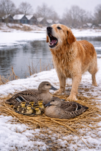 Standing alert on the snowy edge of the river, the dog noticed something unusual — a mother duck and her tiny ducklings trapped near the frozen water. The ice was thin, the ground slippery, and the ducks had nowhere safe to go. The tension in the air was unmistakable.