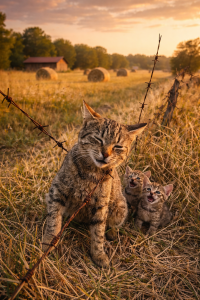 At the fence, the farmer knelt down slowly. The mother cat trembled but didn’t run. The kittens stayed frozen in place.