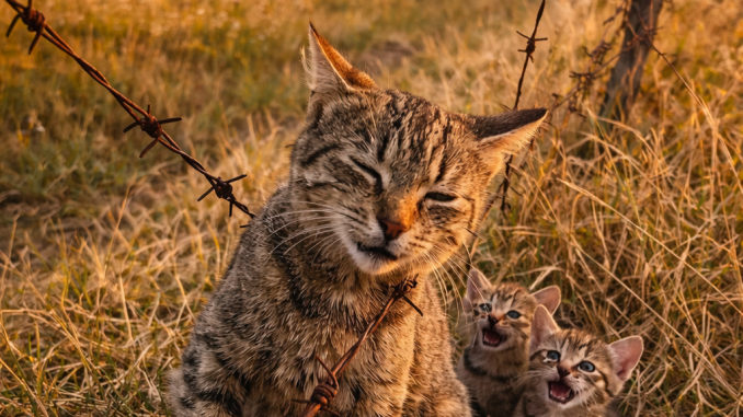A mother tabby cat stood trapped against the sharp wire, her body tense and her eyes half-closed in pain. Every movement pulled the metal tighter.
