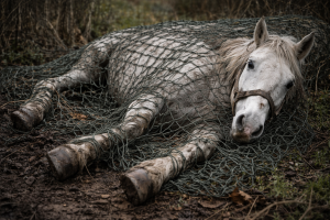 Deep in a quiet forest, a white horse found itself trapped, unable to move, tangled tightly in a net left behind and forgotten. Every attempt to break free only made the situation worse. Exhaustion slowly took over, and the horse was left helpless, lying on the cold, muddy ground.