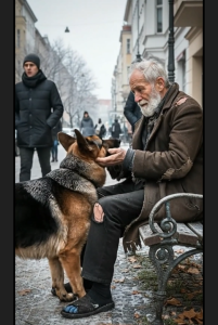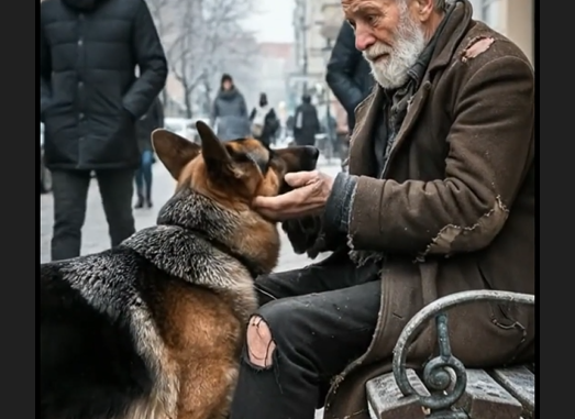 It led the seller straight back to the poor man sitting on the chair, shaking from the cold. The dog gently dropped the blanket at the man’s feet and nudged it toward him.