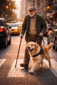 The golden retriever walked ahead, wearing its guide harness proudly. Its posture was calm but alert, eyes scanning left and right as traffic blurred on both sides.