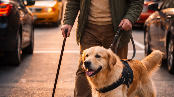 The golden retriever walked ahead, wearing its guide harness proudly. Its posture was calm but alert, eyes scanning left and right as traffic blurred on both sides.