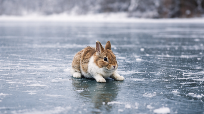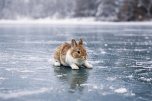 The ice beneath the rabbit was thin and scratched with frost. Snowflakes drifted gently from the sky as the little animal crouched low, trying desperately to find balance.