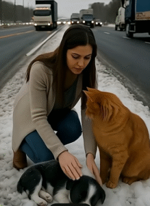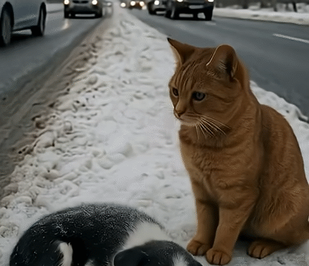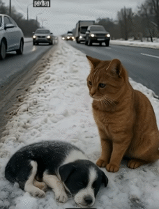 A ginger cat stood silently beside a shivering puppy lying helplessly on a snowy shoulder of the road.