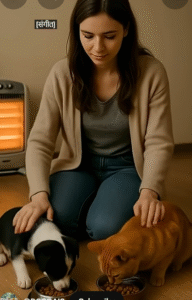 Back at home, in the comfort of a cozy room and soft heater glow, the woman placed food bowls in front of her two new companions.