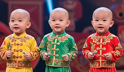 One of them, wearing the red outfit, took a bold step forward and began spinning in slow, careful circles. The one in green followed, trying to imitate the movement, only to wobble adorably and fall on his knees — then burst into the sweetest giggle. The one in yellow clapped his hands enthusiastically, celebrating the moment as though it were the greatest victory ever achieved on a stage.