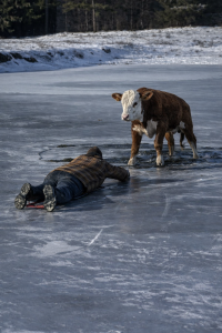 Winter had frozen the pond solid, but not completely. Thin, brittle ice cracked under the weight of a young Hereford calf, standing trembling in the icy water. Exhausted, shivering, and scared, it seemed trapped with no way out.