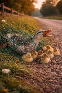 By the side of a quiet rural road, a mother duck lay trapped in a net. She could not move freely, and her wings were tangled. Her ducklings stayed close beside her, confused and afraid. Cars passed by, but no one stopped.