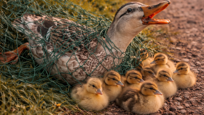 By the side of a quiet rural road, a mother duck lay trapped in a net. She could not move freely, and her wings were tangled. Her ducklings stayed close beside her, confused and afraid. Cars passed by, but no one stopped.